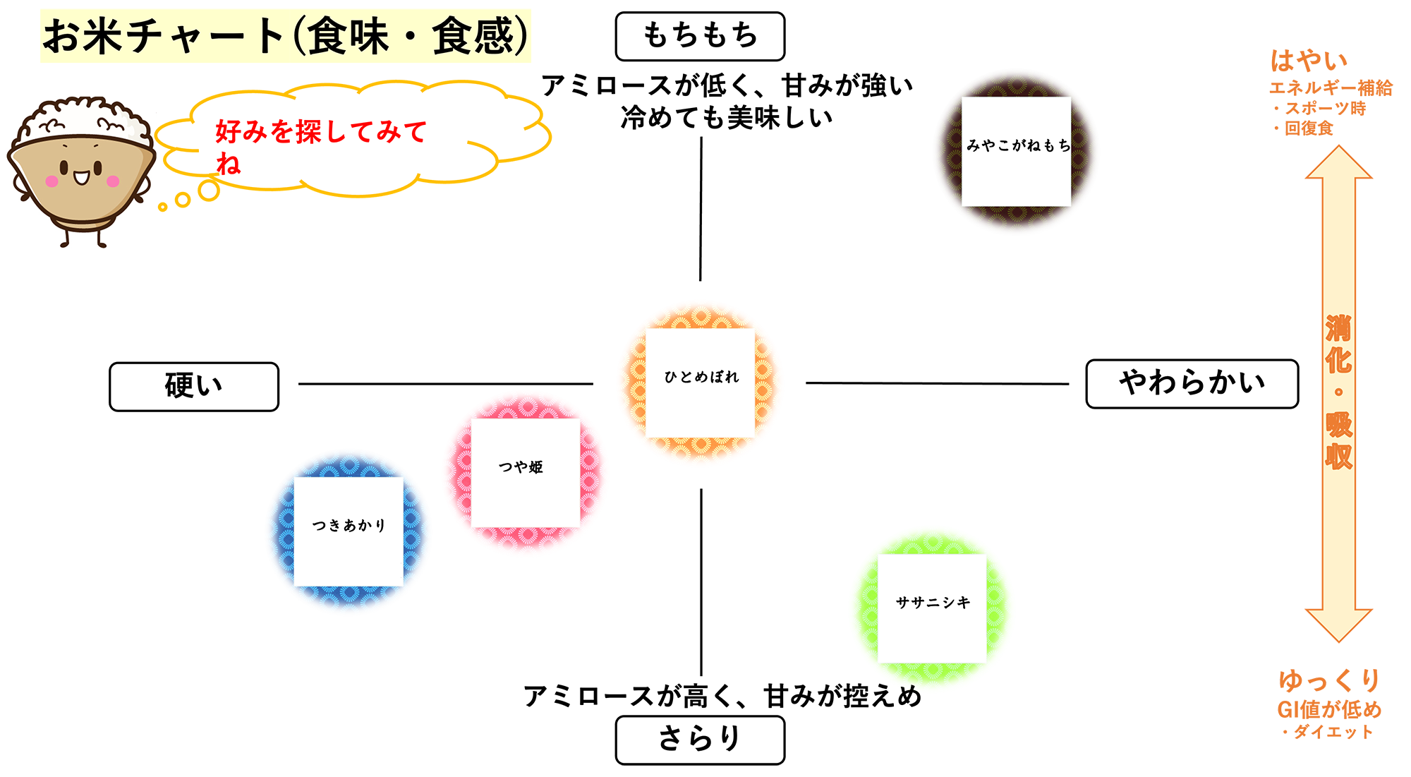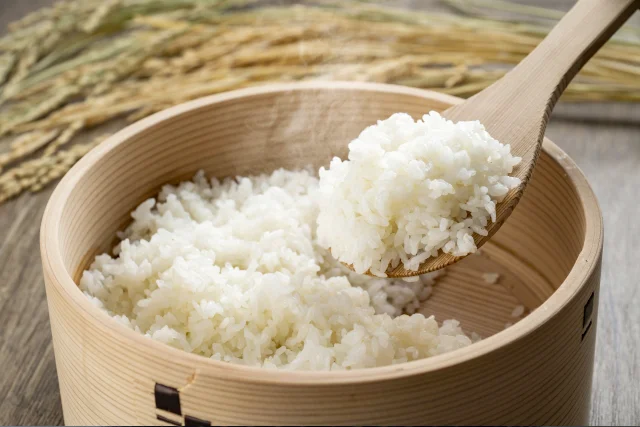 アミロースが高いお米は、消化されにくい難消化性でんぷんを多く含むため、もちもちのお米と比べ糖の吸収が遅いと言われています。