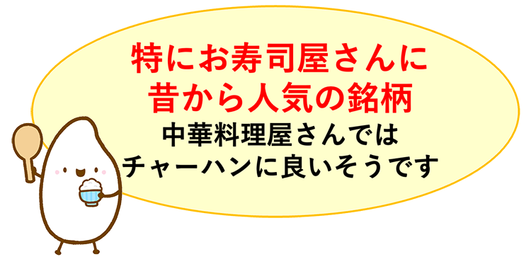 甘みを主張しすぎないため、白米としてはもちろん、寿司、和食、焼き魚、煮物など素材の味を引き立てる日本料理(和食)と相性抜群で、名脇役として、料理に寄り添えるお米です。