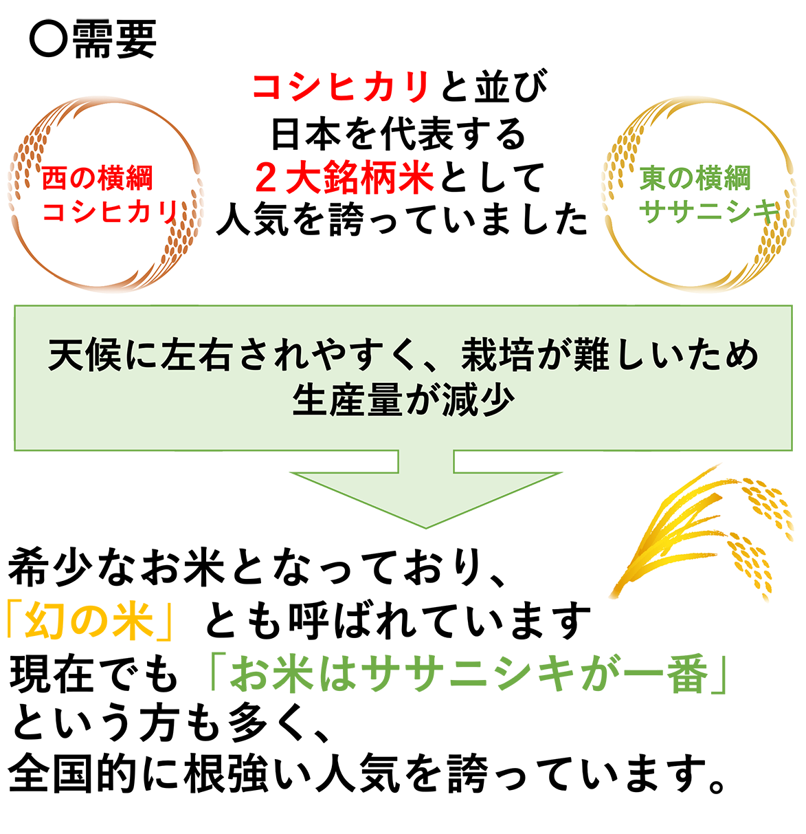 昭和38年にササシグレとハツニシキを親とし宮城県で生まれました!収量の高さ、冷害やいもち病に対する強さ、玄米の綺麗さが親より優れているため東北地方で広く栽培され、昭和62年には全国に広がり、栽培面積はコシヒカリに次いで全国2位となりました。
